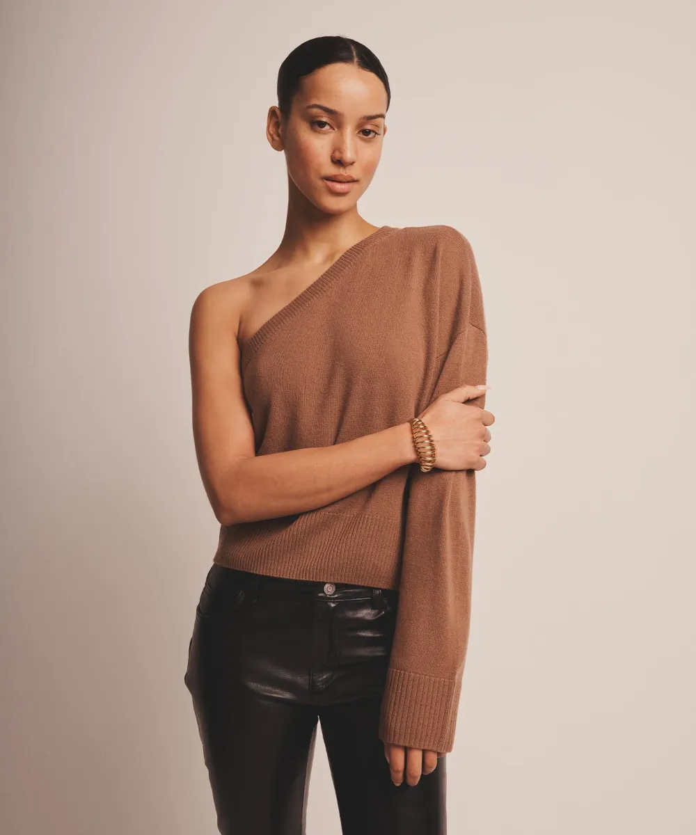 The Cashmere One Shoulder Sweater is a chic knit with a relaxed classic fit and short classic length designed to skim the top of the hip bones. It features a cold-shoulder silhouette, ribbed details, and fitted waistband for added dimension. Crafted from 100% premium, sustainable cashmere.