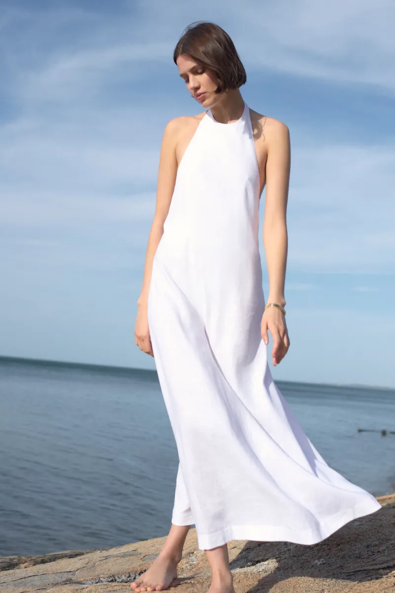 Maxi-style halter-neck dress with adjustable neck tie. Lined bodice and open back. Center-back zip. Fits true to size, take your normal size. 70% viscose, 30% linen.