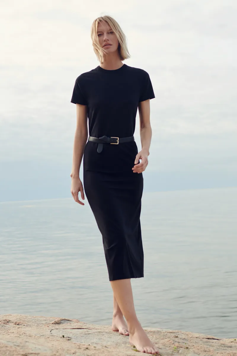 Classic cut, slightly oversized tee dress with crew neck. Features center back seam detail and slit. Fits true to size, take your normal size. 95% cotton, 5% elastane. Gentle machine wash cold, inside out, with like colors. Lay flat or tumble dry on delicate cycle.