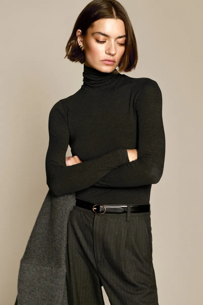 Fitted turtleneck with long sleeves and center back seam detail. Runs slightly small, size up if in between sizes. Model is wearing an S. 95% viscose. 5% elastane. Gentle machine wash cold, inside out, with like colors. Lay flat or tumble dry on delicate cycle .